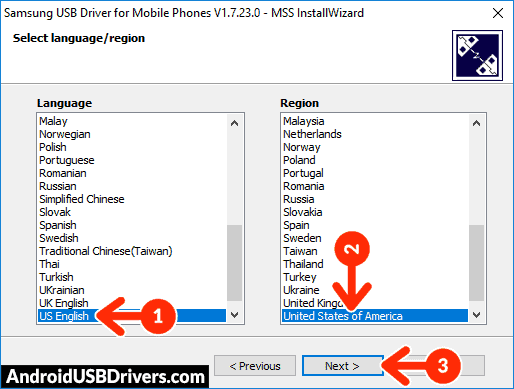 - In the next screen, select the Language as US English and Country or region as United States of America (or Select your region from the list).
